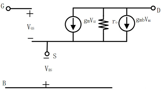 3. 考慮襯底偏置效應(yīng)(體效應(yīng)) 前面我們提到,MOSFET是一個(gè)四端器件,通常將襯底和源極相連作為三端器件使用,但是考慮體效應(yīng)時(shí),$V_{BS}$會(huì)對(duì)漏電流產(chǎn)生影響,廣義上來(lái)看,襯底起到了MOSFET另一個(gè)柵的作用,類(lèi)似的用一個(gè)壓控電流源對(duì)其產(chǎn)生的影響進(jìn)行模擬,其等效模型如下圖: