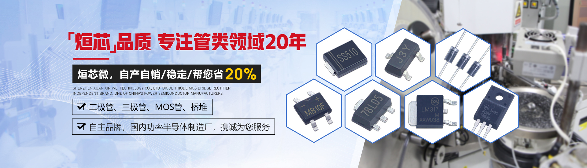 烜芯微專業(yè)制造二極管,三極管,MOS管,橋堆等,20年,工廠直銷省20%,1500家電路電器生產(chǎn)企業(yè)選用,專業(yè)的工程師幫您穩(wěn)定好每一批產(chǎn)品,如果您有遇到什么需要幫助解決的,可以直接聯(lián)系上方的聯(lián)系號碼或加QQ,由我們的銷售經(jīng)理給您精準(zhǔn)的報價以及產(chǎn)品介紹